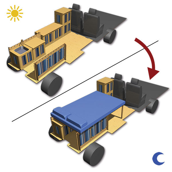 Das System des Bausatzes basiert auf dem Zonenboden, der nach dem Entfernen der Rückbänke des Fahrzeugs mithilfe der bereits vorhandenen Ladungsbefestigungspunkte am Fahrzeugboden verankert wird, ohne dass Löcher gebohrt oder am Fahrgestell irgendeine Art von Veränderung vorgenommen werden muss.