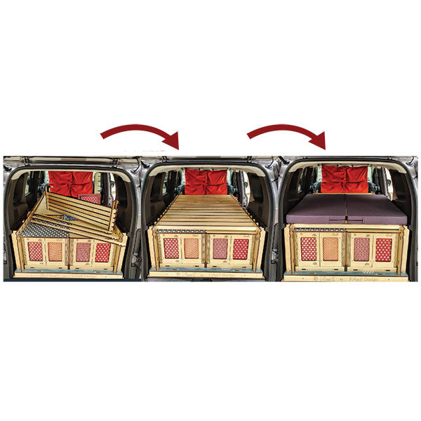 Nach der Montage der Plattform werden die modularen Möbel befestigt, die es Ihnen dank ihrer ausgeklügelten Konstruktion ermöglichen, mit der gleichen Anzahl an verfügbaren Elementen unendlich viele Layouts zu erstellen, ganz nach Ihrem aktuellen Bedarf. Durch die schnelle und sichere Verriegelung ist es jederzeit möglich, mit wenigen Handgriffen die Innenaufteilung des Fahrzeugs zu verändern, niedrige oder hohe Möbel zu schaffen, das Modul mit Spüle oder Herd aufzustellen, Tische und Bänke zu gestalten und nicht zuletzt das Bett im Heck des Fahrzeugs zu realisieren.
