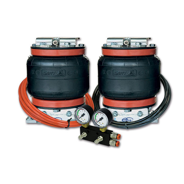 Il kit cinclude tutto il necessario per l'installazione, ovvero due soffietti, le staffe per il montaggio, le tubazioni con i raccordi rapidi e la centralina di gonfiaggio/sgonfiaggio con due manometri.
