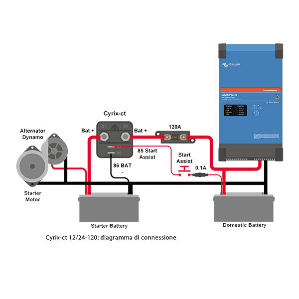 Il Cyrix-CT  rileva automaticamente la tensione del sistema, infatti quando il combinatore rivela che la batteria di avviamento ha raggiunto la tensione di connessione si attiva in modo da permettere la carica in parallelo della batteria servizi.