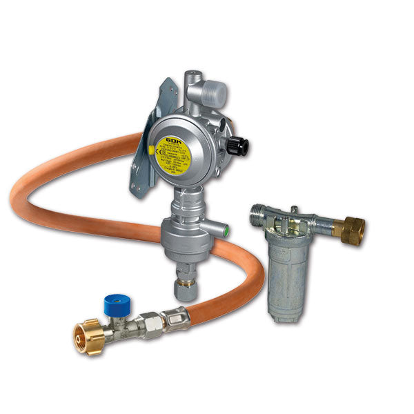 Comprende un regolatore verticale con crash sensor per una bombola, una manichetta L 45 con attacco Germania ed un filtro con cartuccia per separazione oli.