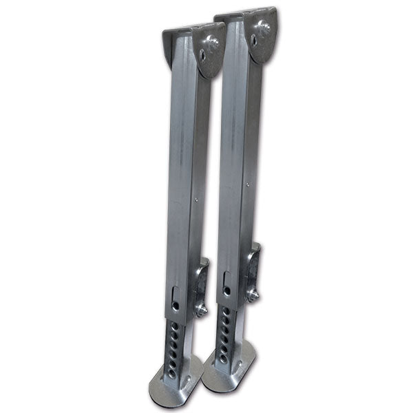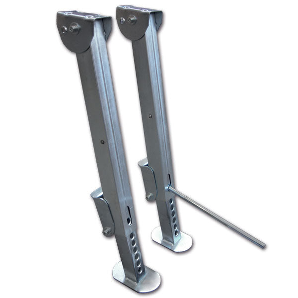 Coppia di piedini di stazionamento large realizzati in acciaio zincato, con leva per il sollevamento e sblocco rapido.