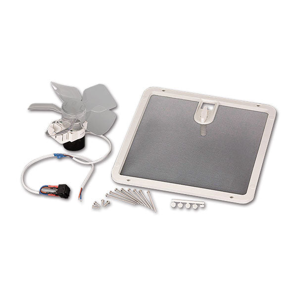 Kit composto da zanzariera. manopola, motore con elica, interruttore, viti e copriviti.