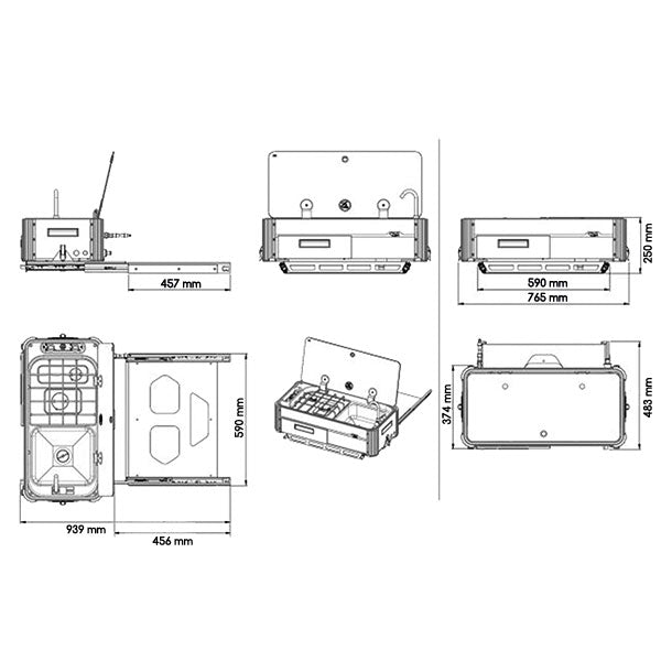 Cucina estraibile con coperchio in vetro temperato nero, lavello e fornello a due bruciatori con accensione piezo elettrica.
