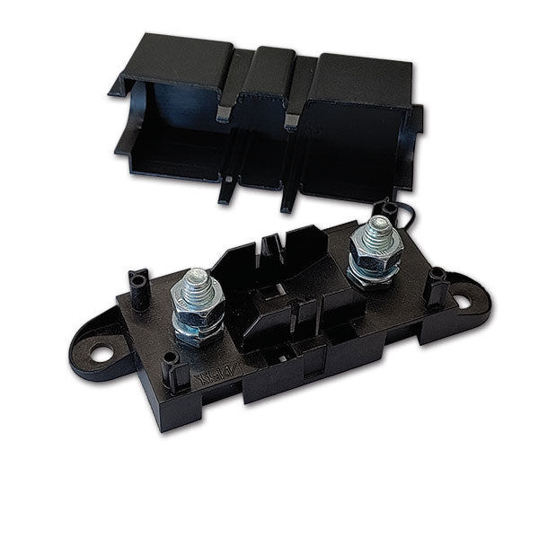 Megaval fixed fuse holder, with fixing slots and lid with lanyard.
