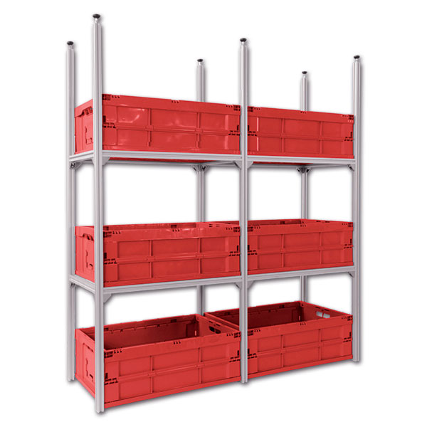Il modulo System Upgrade due scaffali a tre ripiani per posizionare le cassette pieghevoli optional o per riporre ordinatamente tutta la merce in camper.