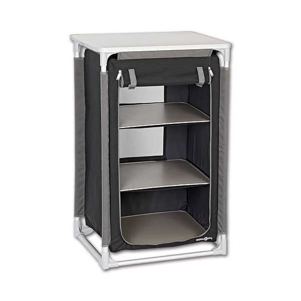 Mobiletto con struttura in alluminio e resistente tessuto in poliestere, dotato di piedini girevoli regolabili in altezza, si adattano a tutti i tipi di terreni, anche quelli irregolari.