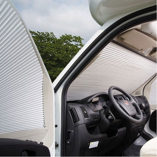 Sistema di oscurante plissettato per parabrezza della cabina per Fiat Ducato X250 e X290, assorbe fino al 99% dei raggi UV ed offre una elevata protezione dal caldo e dal freddo, grazie al