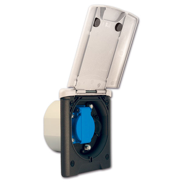 Presa esterna multifunzionale bianca, dotata di presa Schuko con sportellino, presa DIN e presa TV, presa SAT.