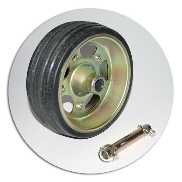 Pneumatico in gomma piena e cerchio in lamiera.